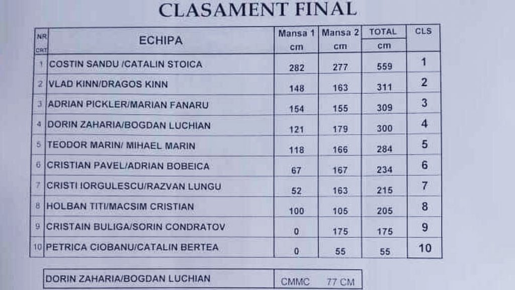 A două zi de concurs, duminică, a fost mai scurtă, pentru că arbitrii să întocmească clasamentul și să fie decernate și premiile. Câștigătoare a fost echipa formată din Cătălin Stoica și Costin Sandu, urmată de cea a lui Vlad Kinn și Dragoș Kinn. Fiecare echipă a fost premiată pentru lungimea totală cumulată a celor mai mari cinci știuci. Deloc surprinzător, au existat și două echipe care nu au prins nimic.